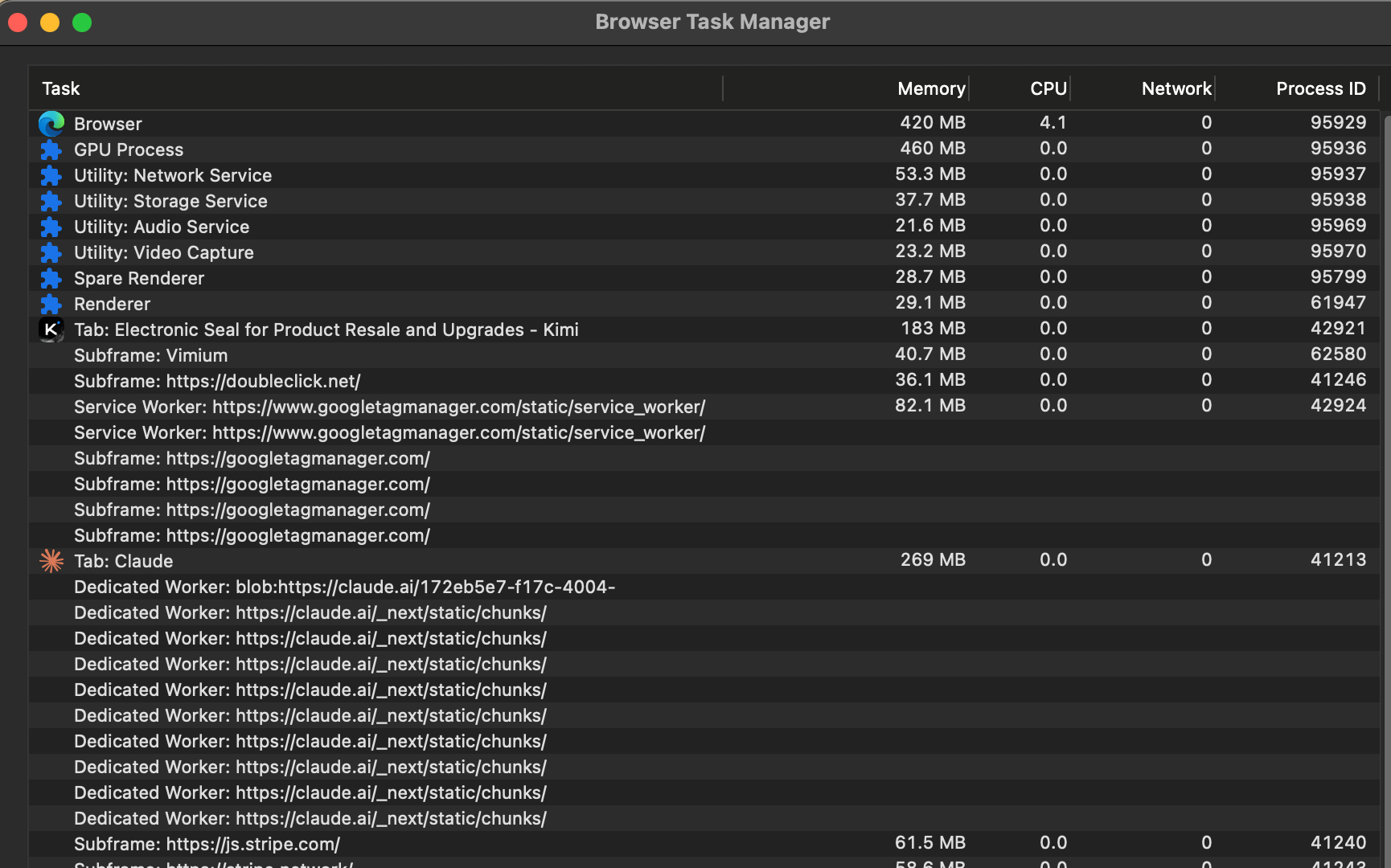 可以在浏览器的任务管理器查看所有的进程